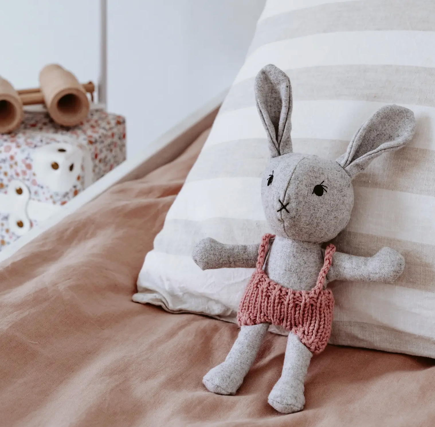 Meet Agatha, the lovable rabbit from our newest vendor: and the little dog laughed. Designed to be cherished from the very beginning, Agatha is made with the softest wool blend fabric and dressed in beautifully knitted Australian Merino wool overalls. Perfectly sized for little hands, she’s a comforting companion and a timeless keepsake.