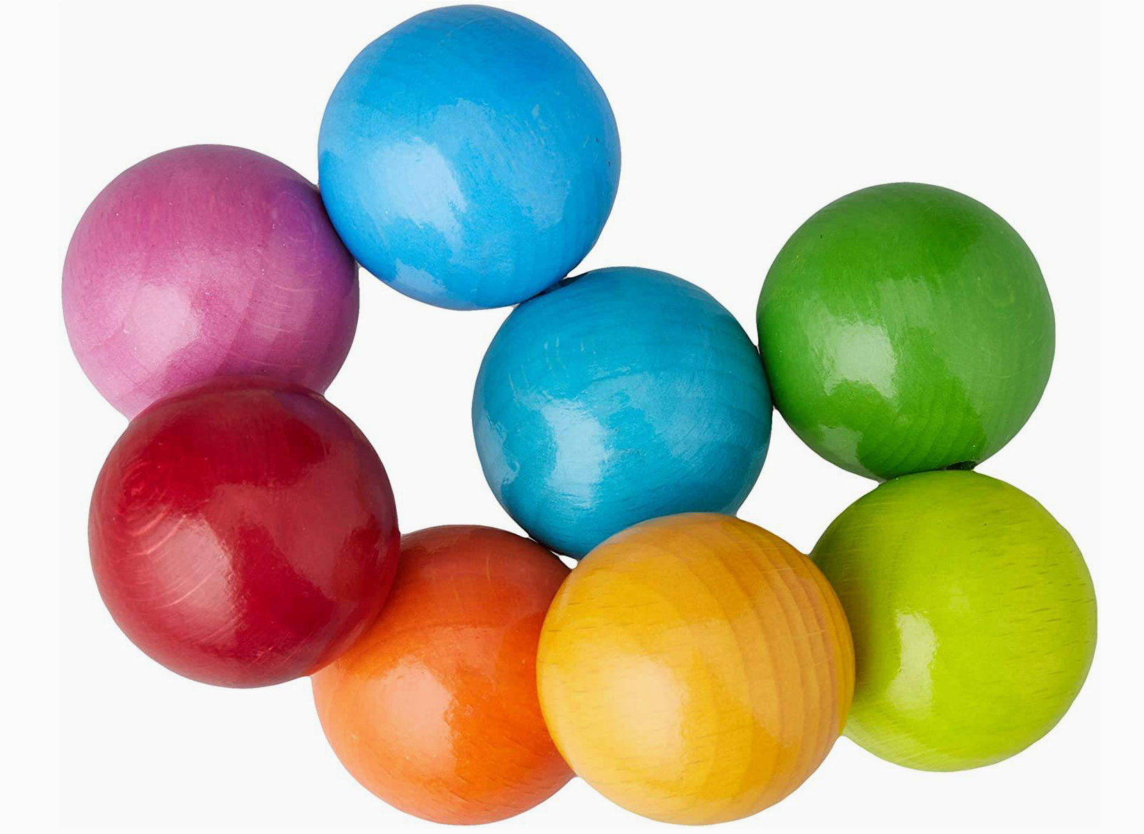 A beautifully crafted, hand-made wooden clutching and teething toy that’s perfect for little hands. Made from sustainably sourced beech wood and finished with non-toxic, water-based lacquers. Designed for children ages 6 - 18 months, eight colorful beechwood balls are threaded together on a thick elastic cord to create an ever changing design for grasping, and twisting. There is a most delightful gentle rattle sound when shaken.