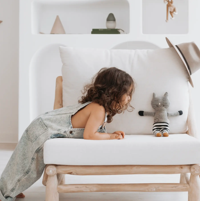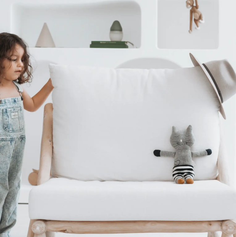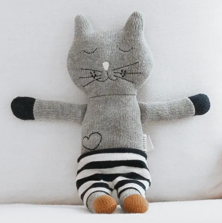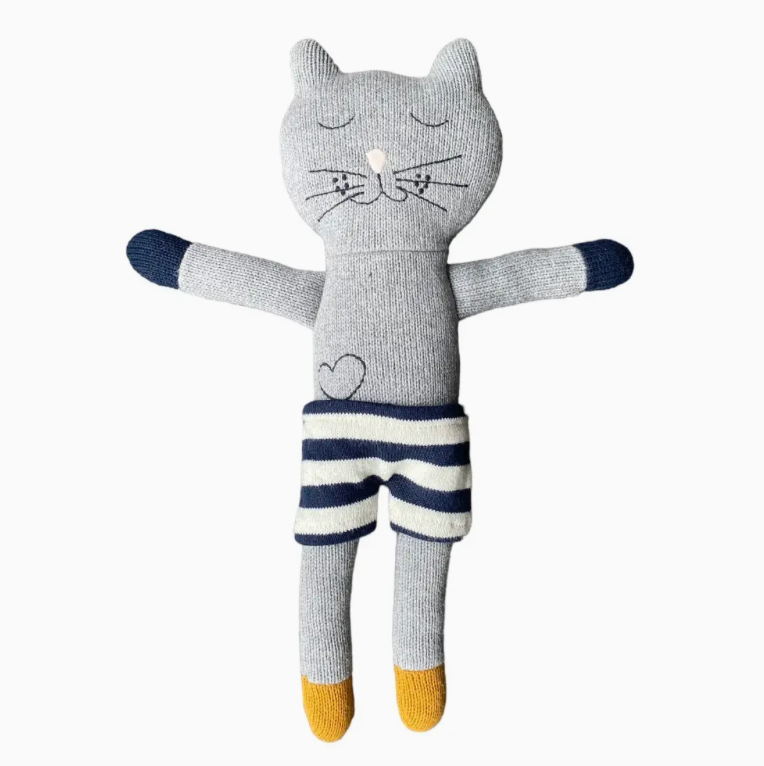 Winston the cat is knitted with super soft pure cotton in grey with mustard feet and a pink nose. He wears navy + white shorts and is the poshest cat around. Filled with polyester recycled fibre. Winston loves reading books, especially at night with his Mom, eating chocolate ice-cream, and playing in the sun He doesn't like making his bed! All of Winston's features are sewn on with no loose parts.