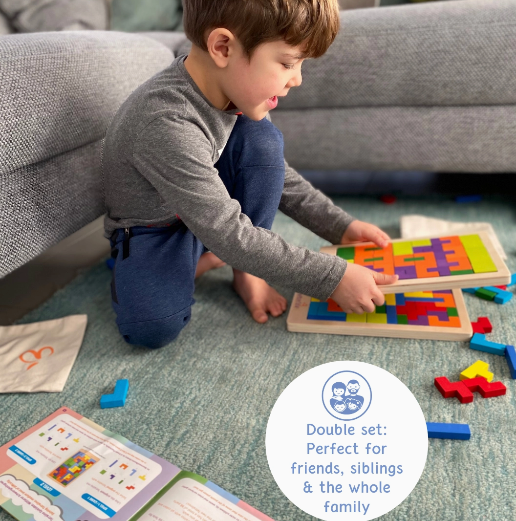 Includes 2 wooden frames, each with 40 tangram-style blocks, plus 8 spare blocks—because parents know that missing pieces happen! Designed for long-term use and peace of mind.